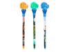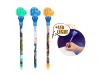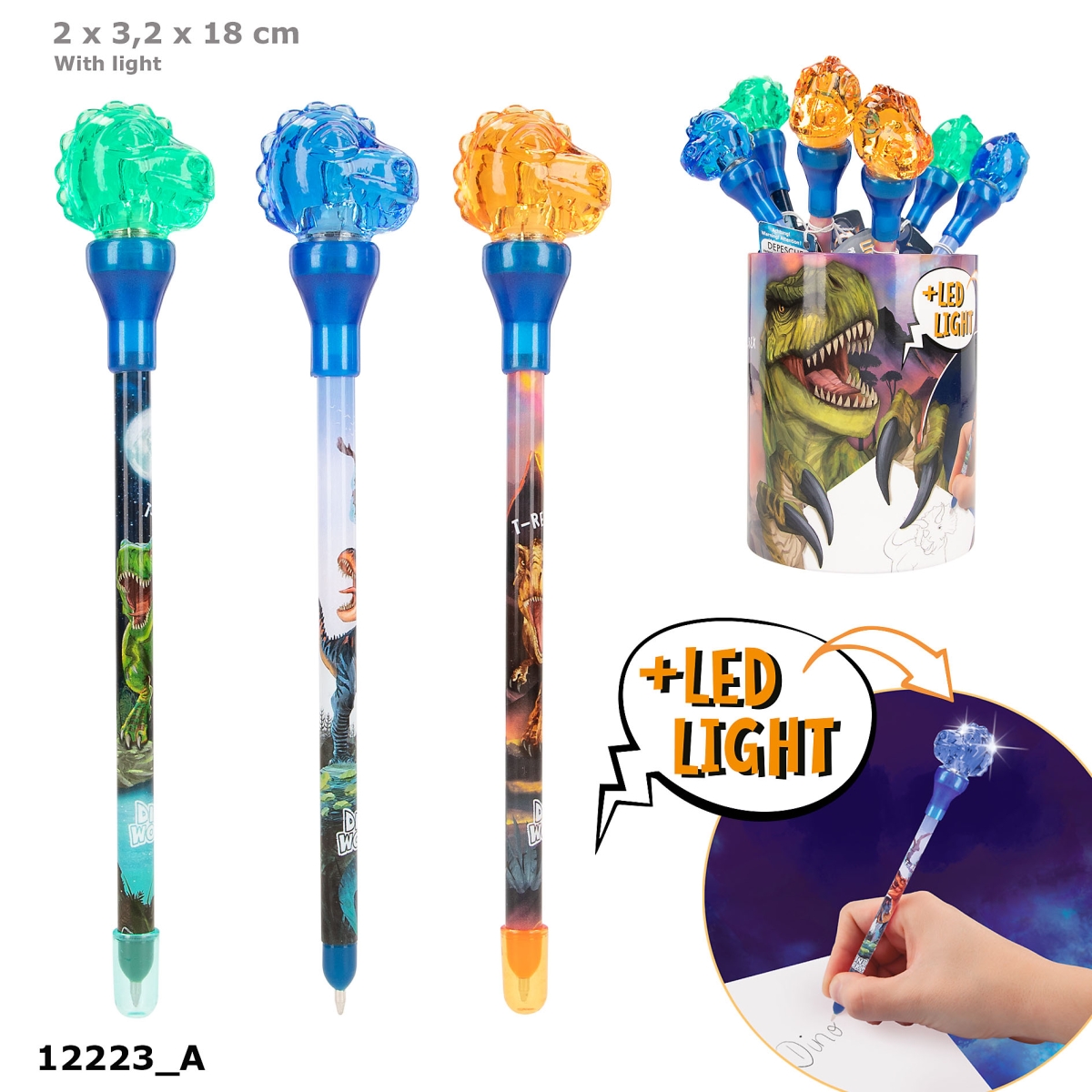 Det er sjovt at skrive med denne kuglepen fra Dino World, der på toppen har et stort dinohoved, der lyser, mens du skriver! På toppen af denne seje kuglepen fra Dino World sidder en imponerende topfigur, formet som et dinohovede, der begynder at lyse, når du skriver med kuglepennen. Fås i 3 forskellige design og farvevarianter: grøn, blå og orange. Kuglepennen skriver med blåt blæk. Bemærk: Batteri og blæk inkluderet, kan ikke udskiftes.