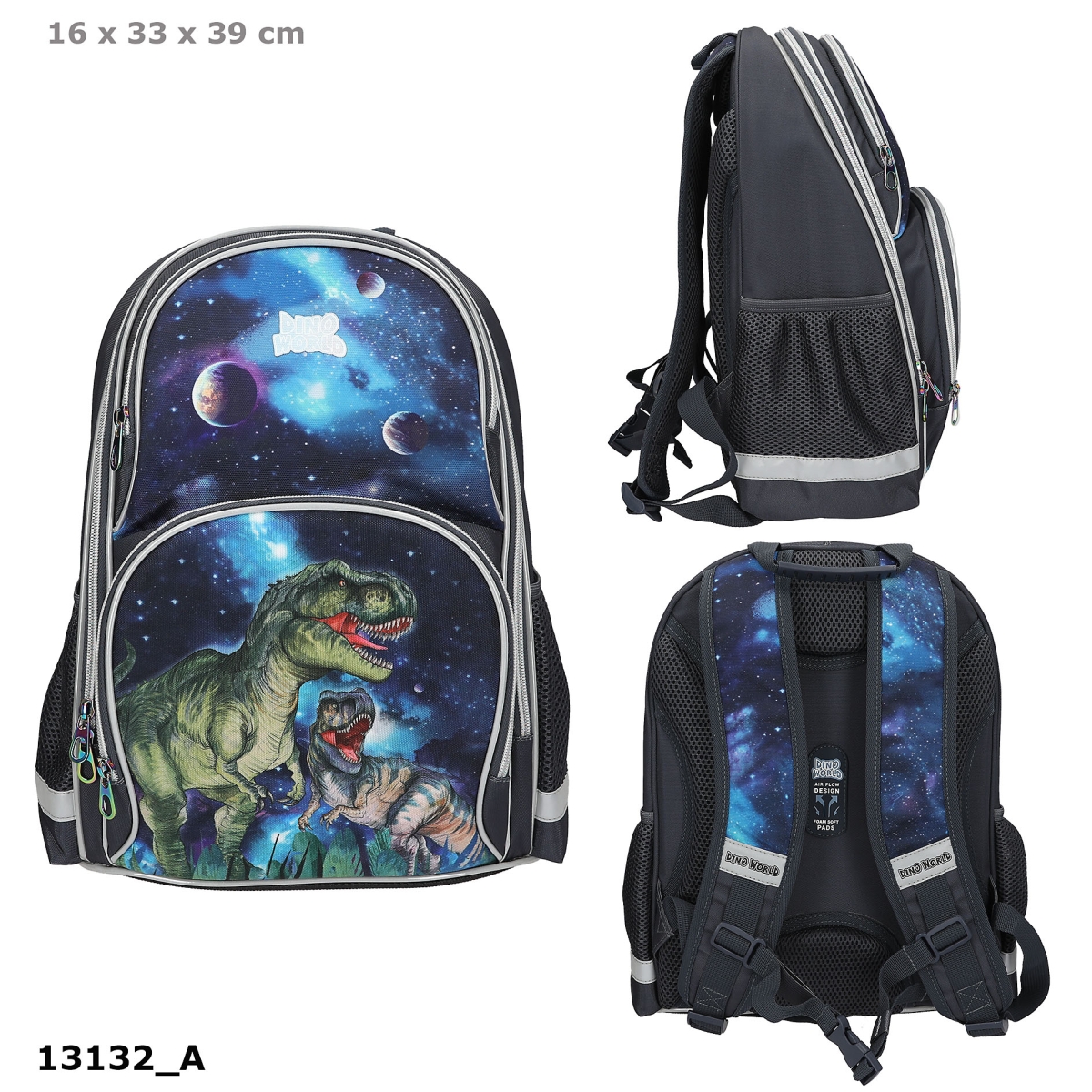 En virkelig lækker og dinotastisk cool skolerygsæk fra Dino World Galaxy serien i flot mørkeblå med sejt galaktisk motiv af to T-Rex dinosaurer på forsiden. Rygsækken har et stort hovedrum samt to rummelige lommer med god plads til bøger, notepad, madkasse og penalhus m.m. Tasken har desuden polstret og ventilerbar ryg, justerbare og polstrede skulderremme samt justerbar brystrem, der sikrer at skoletasken sidder ergonomisk korrekt, en kraftig bærestrop, vand- og smudsafvisende bund, sidelommer i mesh til fx drikkeflaske samt mange refleksdetaljer for bedre synlighed. Mål: 39 x 33 x 16 cm.