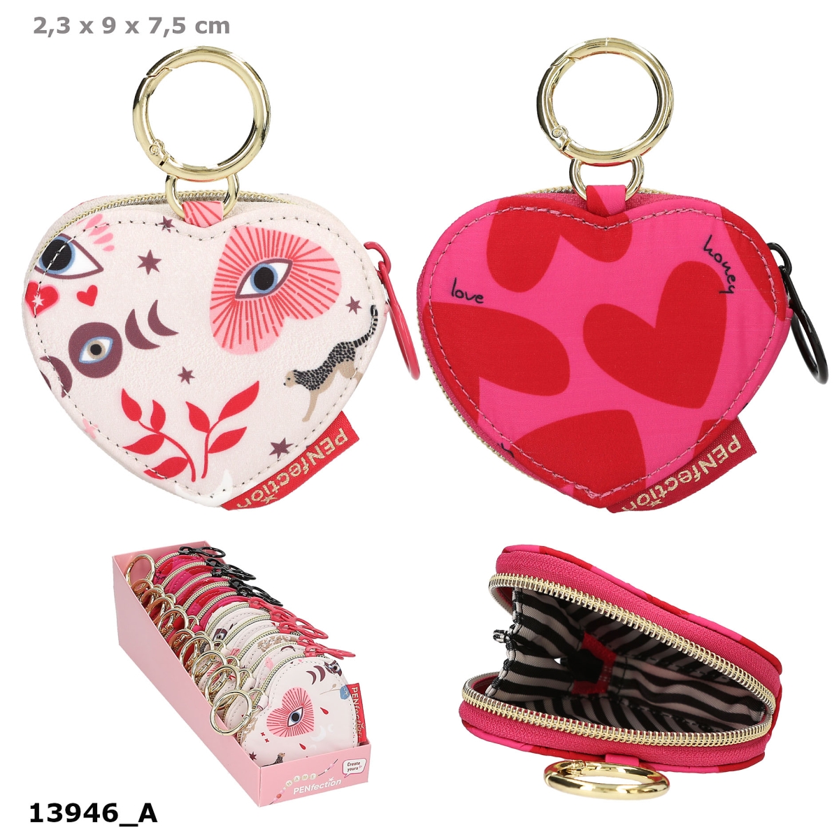Den søde, hjerteformede pung med flotte mønstre og stribet inderfor fra PENfection kan sikkert og smart fastgøres til din taske, rygsæk eller bæltestrop ved hjælp af den runde, guldfarvede karabinhage. Med matchende guldfarvet lynlås med stor, kontrastfarvet lynlåsring i hvilken, du kan fastgøre et vedhæng som fx. en Happy Charm for at personliggøre din pung. Fås i to varianter: pink med rødt hjerteprint, sort- og hvidstribet inderfor samt sort lynlåsring, og svag rosa med mønstret print i rødlige farver, rød- og pinkstribet inderfor samt rød lynlåsring.