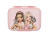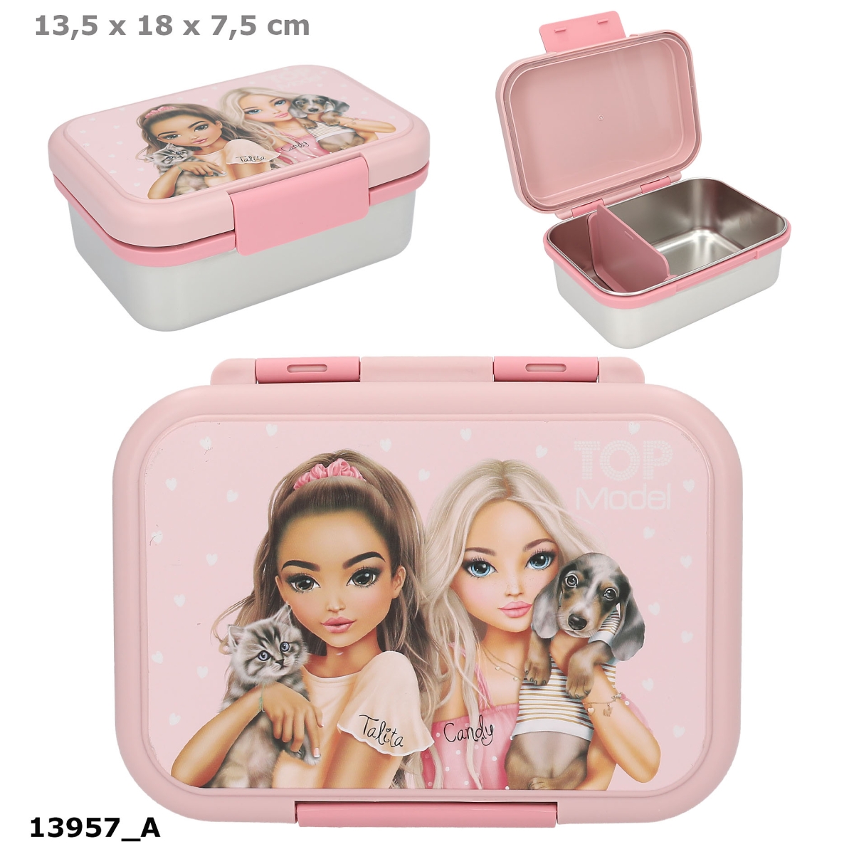 Denne fine og praktiske madkasse i rustfrit stål fra TOPModel har et lyserødt plastiklåg med et sødt hunde- og kattemotiv sammen med TOPModellerne Talita og Candy. Madkassen har et stort, opdelt rum med en aftagelig skillevæg indeni. Madkassen er desuden fremstillet af brudsikkert, lugtneutralt materiale med en silikoneforsegling, der forhindrer lækager og holder maden frisk. Fri for BPA og blødgørere. Tåler opvaskemaskine. Volume: 1 liter; Mål: 17,3 x 13,3 x 6,9 cm.