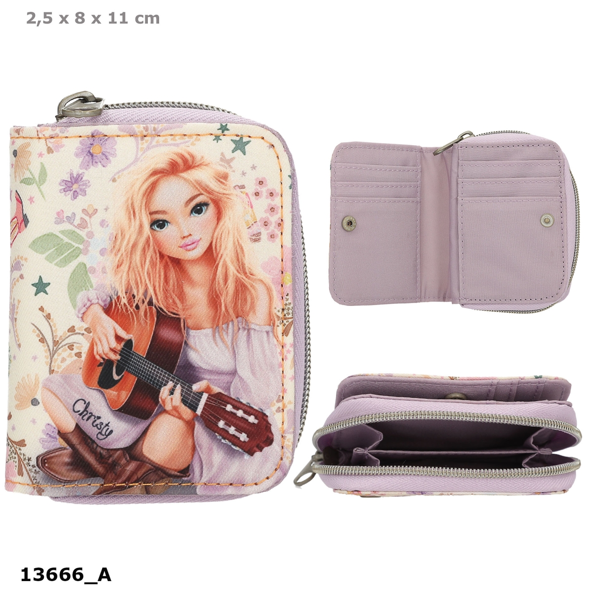 Pungen fra TOPModel COWGIRL serien i cremefarve med lyselilla kontrastdetaljer samt all-overprint med western tema som blomster, cowboystøvler og stjerner. Tasken har et romantisk motiv af TOPModel Christy med guitar på forsiden Pungen er med både lynlås og knaplukning og kan rumme både sedler, kort og mønter. Mål: 3 x8 x 10,5