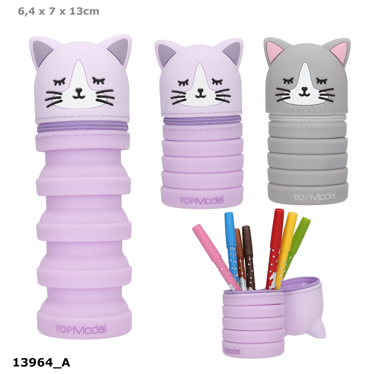 Dette supersøde penalhus fra TOPModels Blooming Kitty serie er i blød silikone og kan skubbes sammen og trækkes ud så du bl.a. kan bruge det som blyantholder og dermed nemt kan få adgang til dine skriveredskaber. Fås i enten lys lilla eller grå med glitter med lynlås og sødt kattehoved. Materiale: silikone.