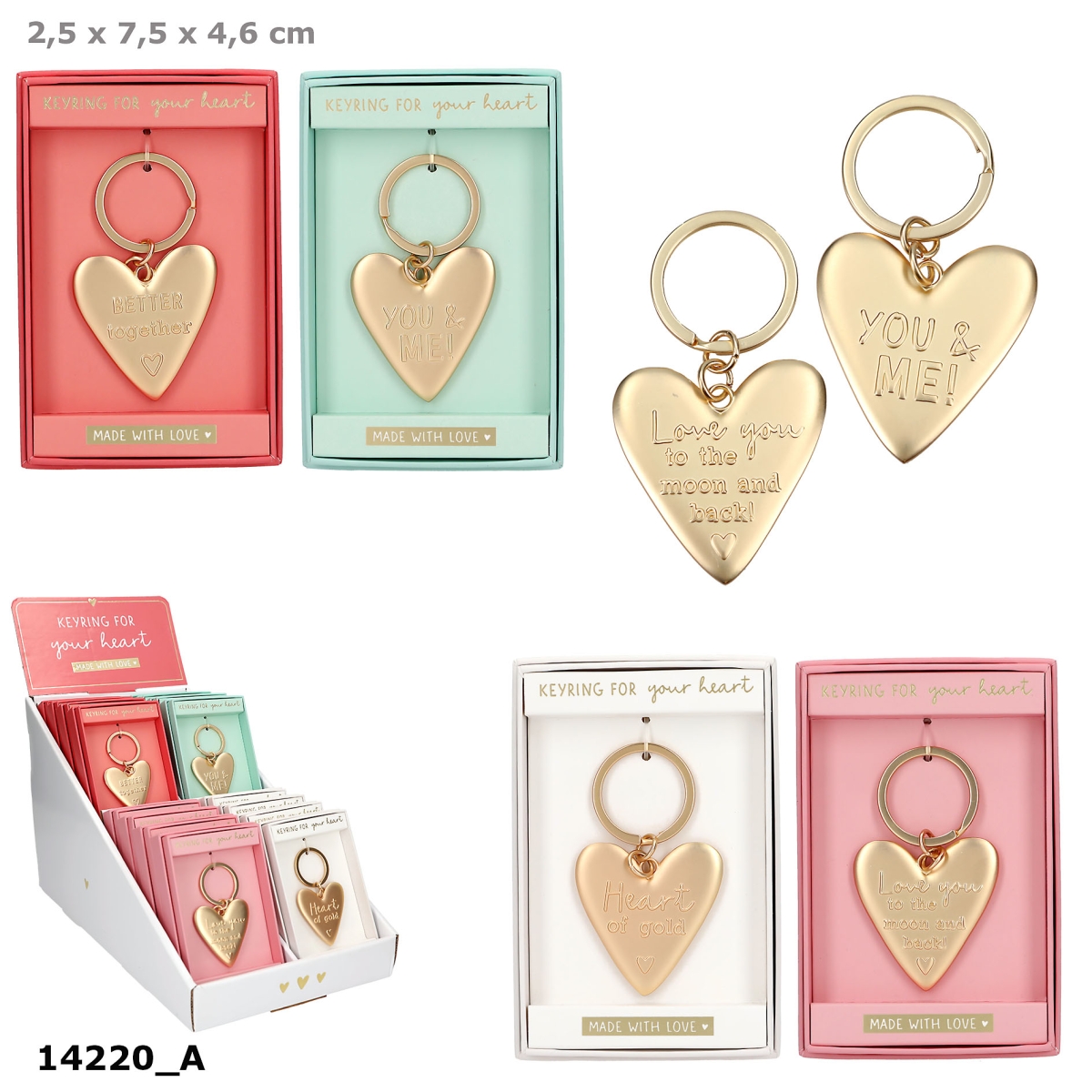 Disse smukke, guldfarvede nøgleringe har et stort hjerteformet vedhæng med indgraveret tekst. Kan anvendes som nøglering til at holde styr på dine nøgler eller fastgøres på din taske eller rygsæk som smukt og personligt vedhæng. Også ideel at give som gave, takket være den smukke æskeindpakning i flot farve med guldtekst. Fås i 4 forskellige farve- og tekstvarianter: "YOU & ME!", "BETTER together", "Love you to the moon and back!" og "Heart of gold".