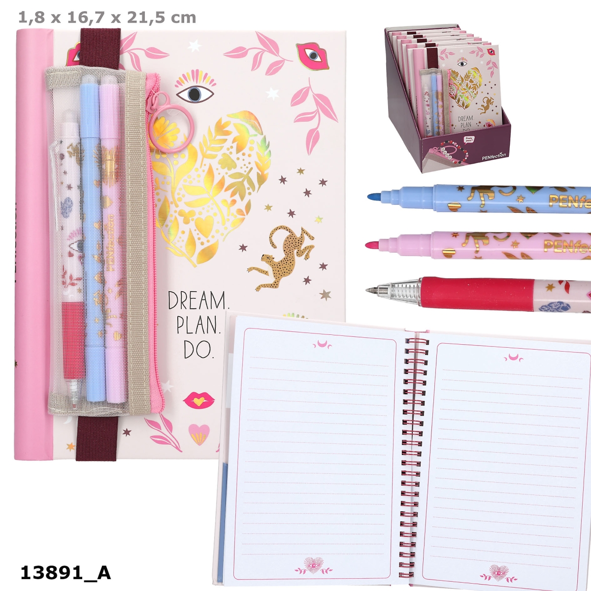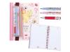 Dette flotte og praktiske sæt, der består af en notesbog og etui med kuglepenne fra PENfection er et absolut must-have med sine lyserøde nuancer, flotte mønstre og guldprint. De tre penne (to highlighterpenne i pink og blå samt en gelpen), opbevares i et lille penalhus i mesh, der er fastgjort til selve bogen med et smart, bredt elastikbånd. Alle penne er viskbare, da de indeholder varmefølsomt blæk, som nemt slettes ved at gnide med den runde ende af pennen, der fungerer som viskelæder. Notesbogen er lavet af robust pap, har et praktisk ringbind indeni og fint linjerede sider samt et ark med cool stickers, der matcher designet.