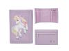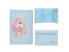 Sød og praktisk pung fra Ylvi med en smuk enhjørning på forsiden på glitrende bagggrund. Pungen har velcrolukning og indeholder flere indvendige rum til opbevaring af kort og sedler, en transparent lomme med til fx rejse- eller navnekort, nøglering samt et separat rum med lynlås til mønter på bagsiden. Fås i tre forskellige design- og farvevarianter: rosa, lyselilla og lyseblå.