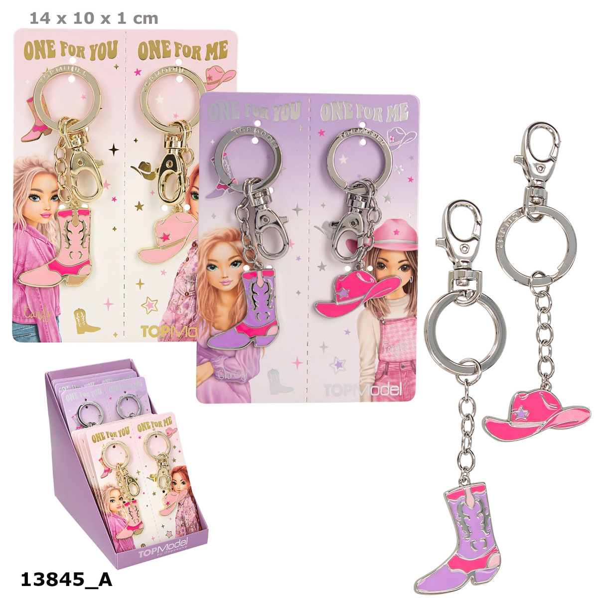 Én til dig og én til mig. Nøgleringsæt bestående af to nøgleringe med hver sit matchende vedhæng med western tema, der passer perfekt til hinanden - som to bedste venner. Fås i to forskellige farve- og metalvarianter: det gyldne sæt har en nøglering med et vedhæng af en lyserød cowboyhat og en med en lyserød cowboystøvle. Det sølvfarvede sæt har et vedhæng med en pink cowboyhat og en med en lilla cowboystøvle. God gaveíde til dig selv og din BFF.