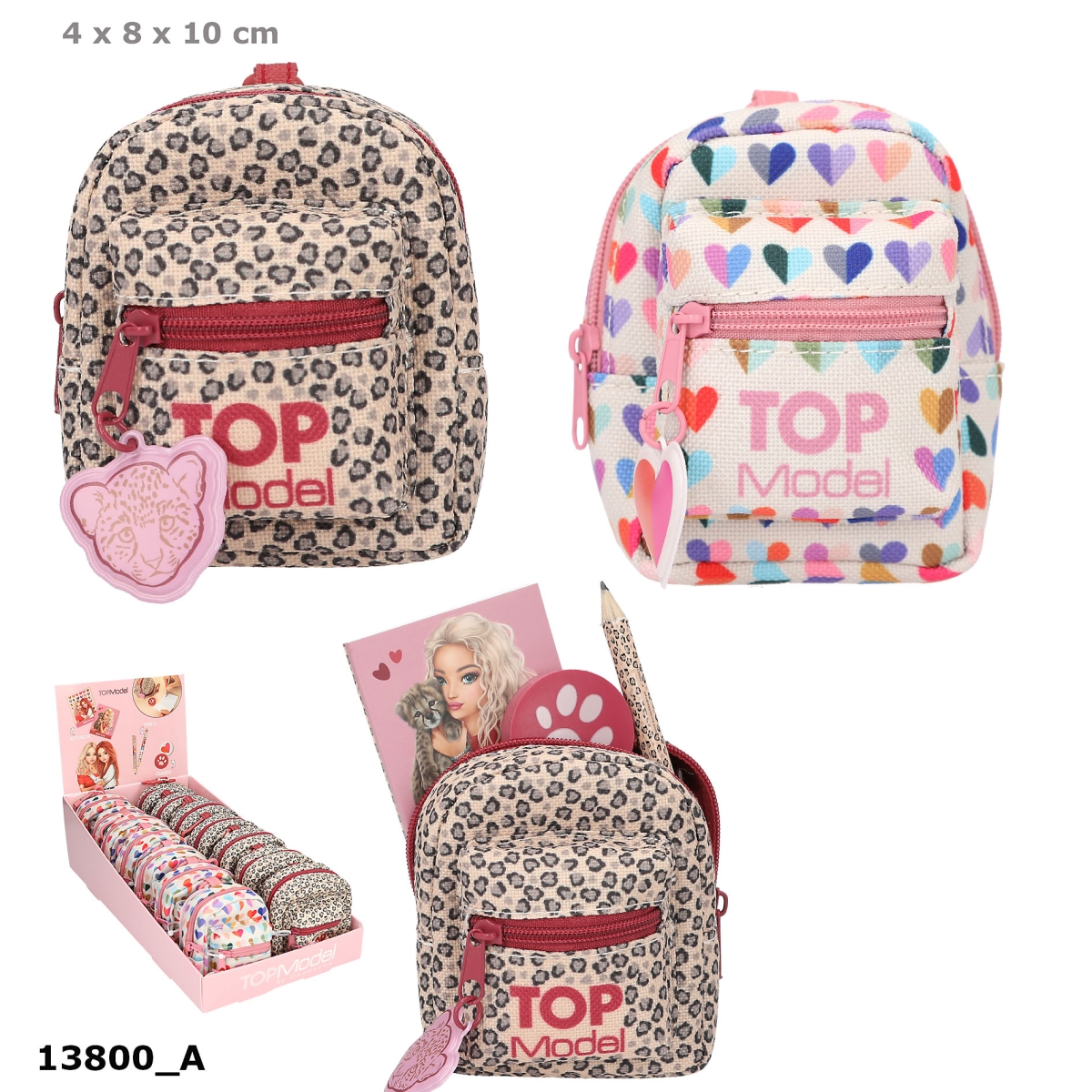 Virkelig nuttet og smart minirygsæk med skrivesæt. Den lille rygsæk har to rum med lynlåslukning og indeholder alt, hvad du behøver til at tage noter: 1 lille blyant, 1 rundt viskelæder samt en lille notesbog med søde TOPModel motiv, der matcher rygsækkens design. Fås i to forskellige designvarianter: trendy leo-print og dobbeltfarvet hjerte design. Rygsækken har desuden en karabinhage, så du kan fx hænge den på din taske, nøglering eller bæltestrop.