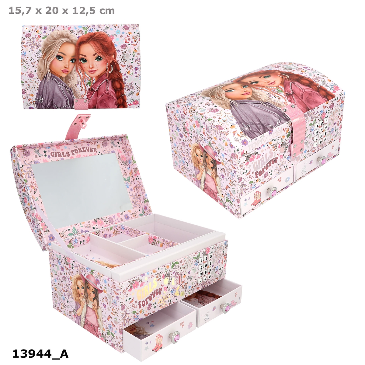 Gem dine små skatte i dette fine smykkeskrin i supersødt TOPModel Cowgirl design med stort motiv af TOPModellerne Candy og Lexy samt all- overprint med western tema som blomster, cowboystøvler og stjerner. Smykkeskrinet har 2 skuffer og et stort indre rum med flytbar, ruminddelt bakke til alle dine kæreste smykker. Smykkeskrinet er desuden udstyret med sikker kodelås, som du selv kan vælge. Når koden er indtastet korrekt, spiller melodien ""Anti-Hero"", hvilket er mega-cool men samtidig også en ekstra sikkerhedsforanstaltning til at afsløre eventuelle ""ubudne gæster"