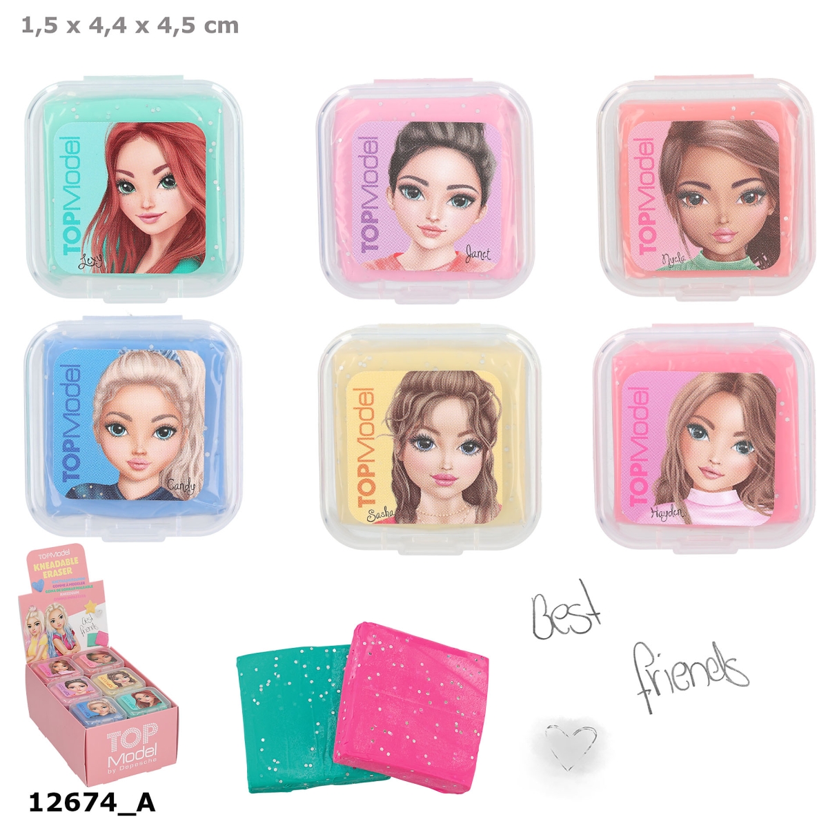 Legetøj og viskelæder i ét: Ælt, form og visk ud! Dette formbare viskelæder er som modellervoks, men fungerer samtidig som viskelæder. Fås i 6 forskellige farvevarianter med glitter: blå, grøn, gul, rosé, lyserød samt abrikosfarvet og er pakket i en genlukkelig, gennemsigtig æske med fint TOPModel motiv.