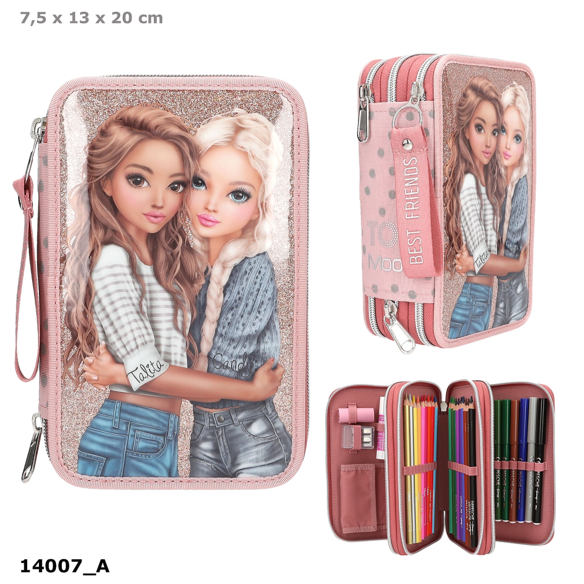 Et virkelig flot og praktisk, trefløjet penalhus fra TOPModel DOTS serien i rosa med fine prik-detaljer og med stort motiv af TOPModellerne Talita og Candy på forsiden af en metallisk glitterbaggrund. Penalhuset er opdelt i tre store rum og er fyldt med alt, hvad man skal bruge til at tegne og skrive med både i skolen og derhjemme som saks, lim, lineal, viskelæder, blyantspidser, blyanter, 18 farveblyanter og farvetuscher. Inkl. stort lynlåsvedhæng i stof med teksten BEST FRIENDS.