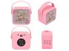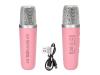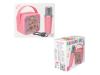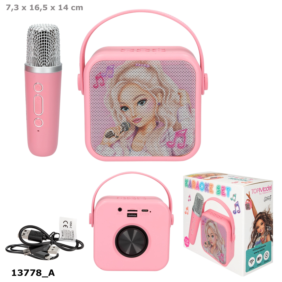 Denne rosa karaokeboksen med mikrofon har et stilig TOPModel motiv samt en valgfri stemmeforvrenger som kan endre stemmen din på fire ulike kule måter. Den kan kobles til alle standardenheter via trådløs tilkobling. Rekkevidden er opptil 10 meter, og spilletiden er ca. 20 timer (ved 50 % volum). USB-C-tilkobling (ladekabel følger med); ladetid: ca. 3 timer.