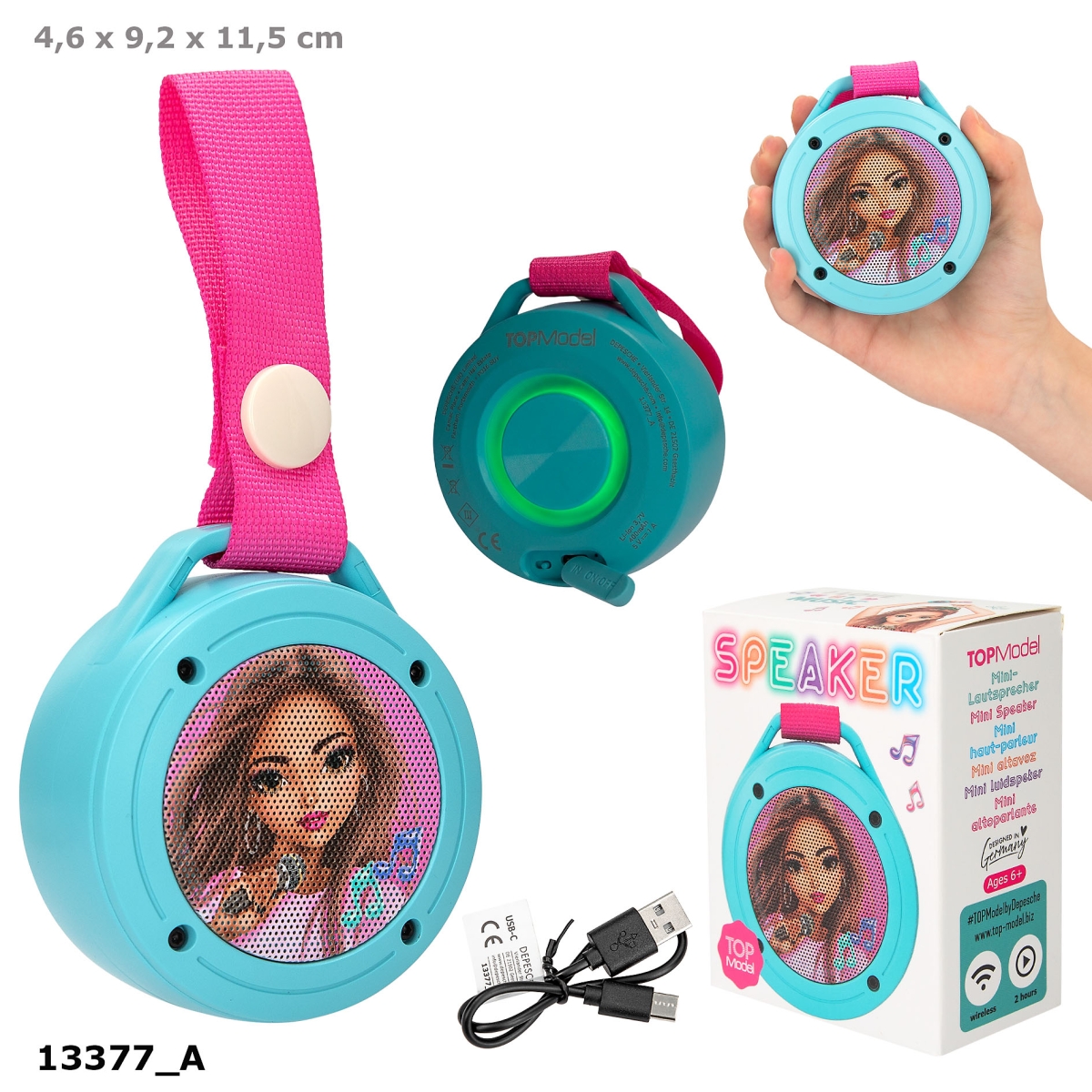 Denne tøffe trådløse minihøyttaleren fra TOPModel i turkis har et stilig TOPModel-motiv og en praktisk hempe slik at den enkelt kan festes til for eksempel ryggsekken eller vesken. En superkul effekt er at en integrert LED- modul blinker i ulike farger når musikken spiller. Høyttaleren kan kobles til alle standardenheter via trådløs tilkobling. Rekkevidden er opptil 10 meter, og spilletiden er ca. 2 timer (ved 50 % volum). USB-C-tilkobling (ladekabel følger med); ladetid: ca. 2 timer.