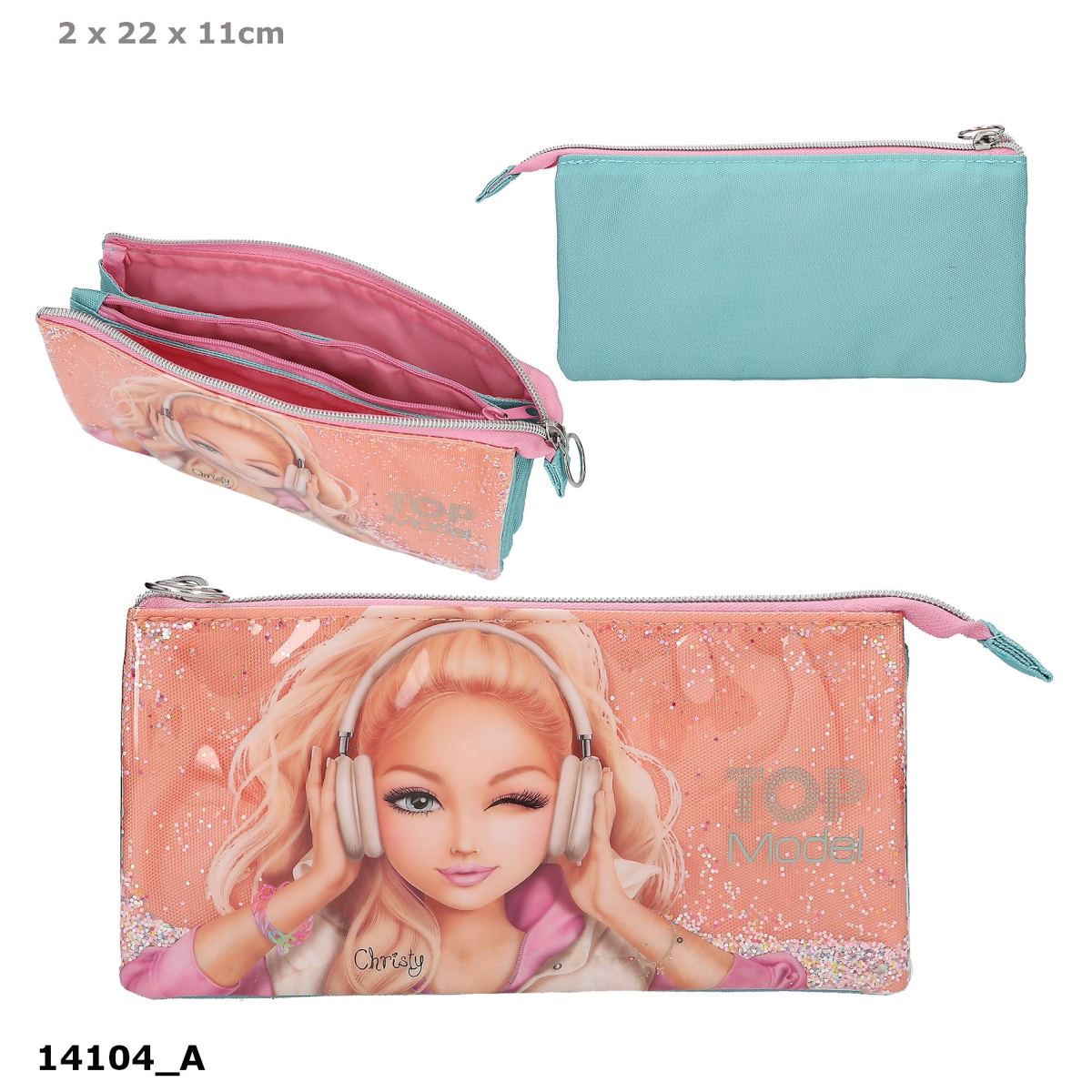 Flott og praktisk pennal fra TOPModel MUSIC serien i rosa, aprikos og turkis, med stort motiv av TOPModelen Christy med hodetelefoner på forsiden på en transparent bakgrunn med flytende metallisk glitter. Pennalet har 2 glidelåser og hele 3 rom til oppbevaring av dine egne tegne og skriveredskaper. Kan også brukes som en fin sminkepung. Tips: Personliggjør pennalet ved å legge til et anheng i den store, gullfargede glidelåsringen.