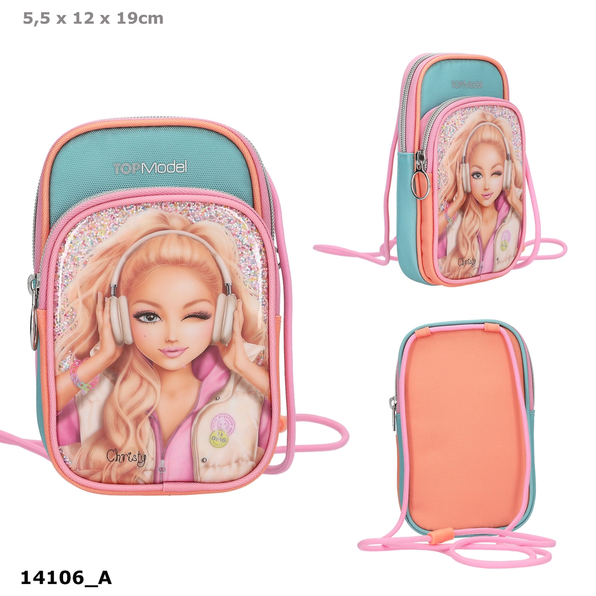 Praktisk mobilveske fra TOPModel MUSIC serien i rosa, aprikos og turkis, med stort motiv av TOPModelen Christy med hodetelefoner på forsiden på en metallisk glitterbakgrunn. Vesken har to rom med glidelåslukking samt en halsrem med sikkerhetslås for å unngå kvelningsfare. Tips: Personliggjør mobilvesken ved å legge til et anheng i den store glidelåsringen.