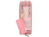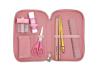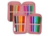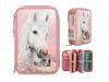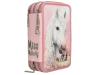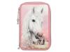 Detta fina pennfodral i rosa från Miss Melody TRUE FRIENDS-serien har ett stort motiv av en vit häst och en liten kattunge på en höbal omgiven av vackra blommor. De tre separata facken är komplett fyllda med allt som behövs för att rita, skriva och pyssla: vardera 18 färg- och tuschpennor, 2 blyertspennor, pennvässare, suddgummi, linjal, sax, limstift samt en liten kardborreficka. Perfekt att ha med på resor, till skolan samt för hemmapyssel. En fin detalj är stigbygelhänget i antik silverlook på dragkedjan.