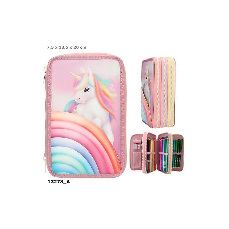 Sött och praktiskt pennfodral från Ylvi med motiv av enhörningen Naya på framsidan bakom en applicerad ficka formad som ett regnbågsmoln i sockersöta pastellfärger. De tre separata facken är komplett fyllda med allt som behövs för att rita, skriva och pyssla: vardera 18 färg- och tuschpennor, 2 blyertspennor, pennvässare, suddgummi, linjal, sax, limstift samt en liten kardborreficka. Perfekt att ha med på resor, till skolan samt för hemmapyssel.